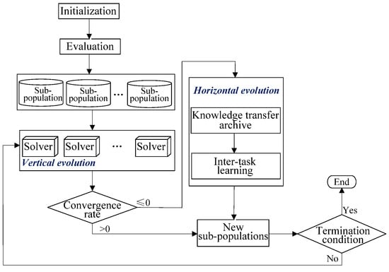 Many MFEA variants have been proposed [31,32]. For example, in order to explore the generality of multifactorial optimization (MFO) when using different population-based search mechanisms, Feng et al. [33] attempted to conduct MFO with particle swarm optimization (PSO) and differential evolution (DE). The derived two multi-tasking paradigms are named as multifactorial particle swarm optimization (MFPSO) and multifactorial differential evolution (MFDE). Chen et al. [17] proposed a general evolutionary framework named MaTEA for solving many-task optimization problems. It chose assisted tasks based on the KullbackLeibler divergence (KLD) mechanism that can be used to measure the similarity among different tasks.