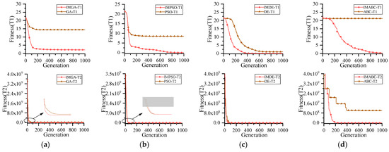 The convergence curves of IMTO and MFO in 1000 iterations are illustrated in Figure 4, and they can tell the search efficiencies of different algorithms. Each sub-figure shows the optimization processes of T1 and T2. Y-axis represents the fitness curves and X-axis denotes the number of generations. This work just shows the convergence trace of P5 due to page limitation. It can be easily found that IMTO possesses faster convergence than MFO. This is because shared archives can generate similar genetic materials, and IMGA, IMPSO, and IMDE can update the evolution direction of worse-performing individuals. Obviously, the more similar tasks, the greater optimization facilitation. MFEA, MFPSO, and MFDE control knowledge transfer through the rmp value and neglect task similarities, thus easily causing negative optimization transfer. So, the convergences of MFEA and MFPSO are slower than IMTO’s.