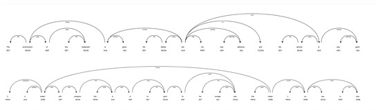 To make full use of the information, the global–local information is modeled with the help of a bidirectional long short-term memory network (Bi-LSTM). The dependencies of the labels are then constrained using conditional random fields (CRF), which are automatically learned by the CRF layer from the training data during the training process. The illegal case of the label “I” preceding label “B” is avoided. When the model predicts the aspect label of the current word, it is important to understand the semantics of the previous word as well as to pay attention to the information of the latter word. After feeding the global–local contextual word vectors to the BiLSTM module and semantic modeling of each word, we obtain the final sequence . For the real label sequence , the output graph of CRF is connected by undirected edges to predict the probability of the correct label for each word based on the state features and transfer features. The conditional probability formula is shown below.