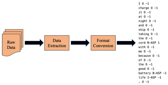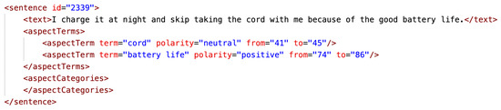 To evaluate the performance of our proposed model, we evaluate and compare the ATE model and the ASC model on two baseline datasets. The two baseline datasets are the laptop domain dataset and the restaurant domain dataset from the SemEval-2014 Task 4 challenge [3]. Each example text in the dataset is labeled with aspect terms and sentiment polarity. The original dataset was stored in XML format. The data were preprocessed in the experiment to reformat the original dataset. An example of the raw data is shown in Figure 4. The data pre-processing process is shown in Figure 5. Detailed information on the dataset is shown in Table 1 below.