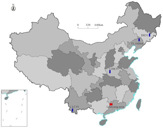 The DH31 profile (E 128°22′22″, N 43°18′44″) developed over the Dunhua monzogranite in a temperate monsoon climate. The depth of DH31 profile is ca. 11 m, and 13 samples are collected sequentially from the topsoil downward to the monzogranite. Details, including descriptions, elemental concentrations, and the analytical qualities of these samples, can be found in Reference [8]. The TL19D04 profile (E 123°56′44″, N 42°26′16″) formed on the Tieling monzogranite in a temperate continental monsoon climate. The depth of TL19D04 profile is ca. 6 m, and 9 samples are collected sequentially from the topsoil downward to the monzogranite. Details of these samples can be found in Reference [13]. The LHK55 profile (E 112°07′09″, N 33°49′06″) developed over the Taishanmiao granite in a warm temperate continental monsoon climate. The depth of LHK55 profile is ca. 5.2 m, and 11 samples are collected sequentially from the topsoil down to the granite. Details of these samples can be found in Reference [14]. The LC19 profile (E 100°18′05″, N 22°12′24.2″) formed on the Lincang granite in a subtropical monsoon climate. The depth of LC19 profile is ca. 14 m, and 20 samples are collected sequentially from the topsoil down to the granite. Details of these samples can be found in Reference [15].