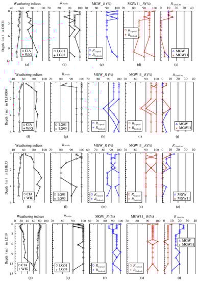 The CIA values of samples from DH31, TL19D04, and LHK55 profiles range from 49.8 to 56.6, from 50.9 to 57.4, and from 49.2 to 57.6, respectively (Figure 3a,f,k). The WIG values of samples from these three profiles range from 68.5 to 89.8, from 64.6 to 86.9, and from 63.6 to 94.3, respectively (Figure 3a,f,k). According to the classification values of 60 and 80 on CIA [20] and values of 20 and 60 on WIG [6,8], these three profiles have undergone incipient weathering. While CIA values of samples from LC19, LY18D13, and LY18D06 profiles in south China range from 53.0 to 94.1, from 59.8 to 83.6, and from 50.7 to 93.1, respectively (Figure 3p and Figure 4a,f). The WIG values from these three profiles in south China range from 5.2 to 76.0, from 15.6 to 67.8, and from 6.3 to 86.1, respectively (Figure 3p and Figure 4a,f). These values indicate that the profiles in south China have undergone extreme weathering.