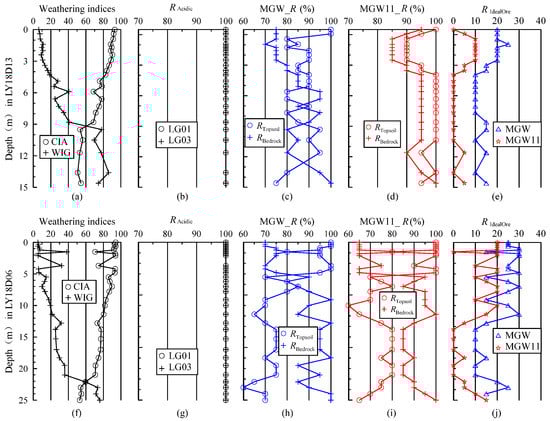 Weathering indices and gene similarities of samples from weathering profiles of LY18D13 and LY18D06 in Lianyang area. (a–e) are the weathering indices, acidic similarities, similarities of MGW, similarities of MGW11, and mineralization similarities respectively in profile LY18D13. (f–j) are those in profile LY18D06.