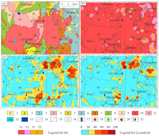 Geological map of Lianyang area (a) and geochemical maps of the LG_CR (b), RIdealOre of MGW (c), and RIdealOre of MGW11 (d). Figure 5a is modified after the G49 with a scale of 1:1000,000 from China Geological Survey with notes are as the followings. 1—Quaternary sand and gravel mixed with clay silty sand; 2—Cretaceous sandy conglomerate, pebbled sandstone and siltstone; 3—Jurassic sandstone, siltstone, grit stone and mudstone; 4—Triassic limestone and mudstone; 5—Permian limestone and mudstone; 6—Carboniferous dolomitic limestone and dolomite; 7—Devonian sandstone and dolomitic limestone; 8—Cambrian sandstone, slate and siltstone; 9—Proterozoic sandstone, siltstone and slate; 10—Monzogranite; 11—Granodiorite; 12—Quartz-dioritic porphyrite; 13—Peridotite; 14—Petrological boundary; 15—Fault; 16—Main residential place; 17—Locations of LY18D13 and LY18D06 weathering profiles; 18—Au deposit; 19—Cu deposit; 20—Polymetallic W deposit; 21—Mo-Fe deposit.