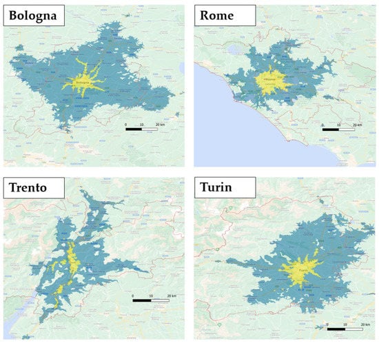 59], the municipalities of Turin, Trento, and Bologna rank much better than Rome in terms of indicators of pedestrian areas, bicycle lanes, interchange car parks and low-emission vehicle fleets. As far as Trento is concerned, there is less use of public transport than the other three cities, with a passenger/inhabitant ratio of less than 200, compared to a ratio of around 300 or more. Despite a fair availability of seats on public transport, the conformation of the municipal territory and the low percentage of coverage can lead to low use of this mode. There is a very good level of infrastructural supply to support sustainable mobility in terms of parking spaces and bicycle lanes. At the same time, however, there is a more car-centred pattern of habits, evidenced by the low level of public transport use and a high rate of motorisation, although characterised by a high share of lower emission vehicles.