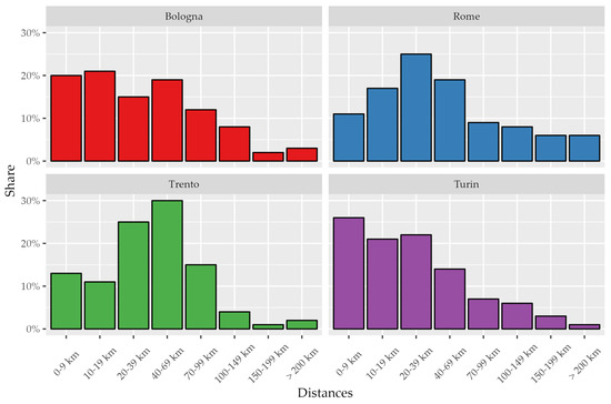 Figure 2). With the exception of the case of long commuters (relevant for Rome workers) longer distances are recorded for respondents from the province of Trento, where 70% cover between 20 and 100 km per day, compared to 43%, 45%, and 52% in Turin, Bologna, and Rome, respectively. Trento is confirmed as a dispersed city. It is characterised by high average values of home-to-work distances, but at the same time by a low standard deviation of distances, suggesting more similar individual profiles. Rome shows the highest commuting distances, especially taking into account the frequency of those in the highest classes (one in five Rome workers travels more than 100 km a day).