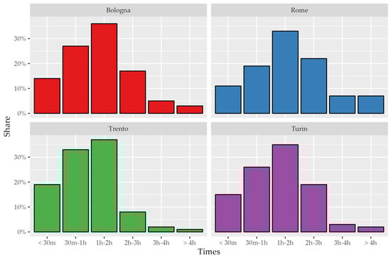 Figure 1. Daily commutes of more than 2 h are travelled by 11% of workers in Trento, 24% in Bologna and Turin, and 37% in Rome (