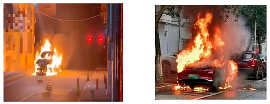 This research considered the roadside parking environment in urban residential areas. The road was an urban branch road. The surroundings of the sidewalks were mostly residential buildings, green belts or other areas that hindered pedestrian movement and where combustible items were present. The actual scene of an EV fire accident caused by the thermal runaway is shown in Figure 1, and the scenario’s sketch maps in this study are shown in Figure 2 and Figure 3.
