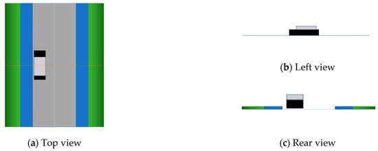 The vehicle size was set with reference to the Tesla Model3. The specific parameters of the scenario are listed in Table 2. To reduce the computational complexity, a three-dimensional simulation model was built with fewer curved surfaces, without considering the arcuate surface of the tire and the vehicle body and considering the common environment in a residential area.