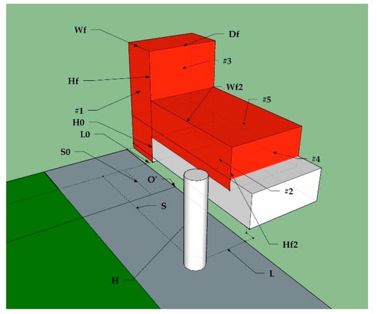 EV fire combustion causes turbulence in the surrounding atmosphere; therefore, the shape of the flame changes owing to the turbulence. To simplify the conditional parameters of the combustion, a cuboid SFM was adopted in this study and only the height of the solid flame and the inclination of the downwind direction were considered. The flame height was obtained by referring to several new-energy vehicle fire accidents. The study assumed that the lateral jet distance of the flame was 2 m in the thermal runaway stage and 2.8 m in the vehicle combustion stage. The flame-size parameters are shown in Figure 4 and listed in Table 3.
