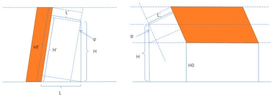 For the tilted flame formed under the airflow conditions, the angle between the tilted flame surface and the vertical line should be considered when calculating the radiation view factor between the flame surfaces and the pedestrians. The sketch is shown in Figure 5.