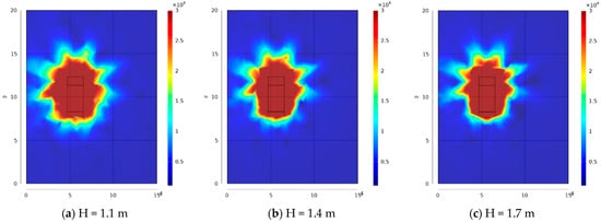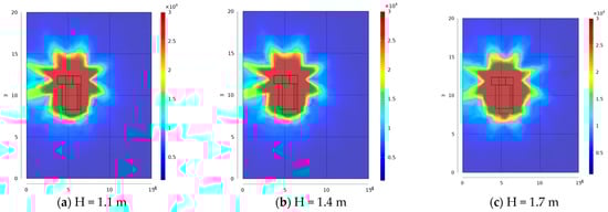 We assumed that the PHRR per unit area was ; the combustion efficiency was 1; and the combustion projected area was , with the unit: m2, estimated from the projected area of the vehicle. Therefore, the PHRR of the flame in the burning EV in the thermal runaway combustion stage was and in the vehicle combustion stage was . With the parameters in Section 3.2, the vehicle combustion stage was .