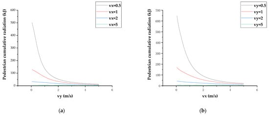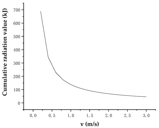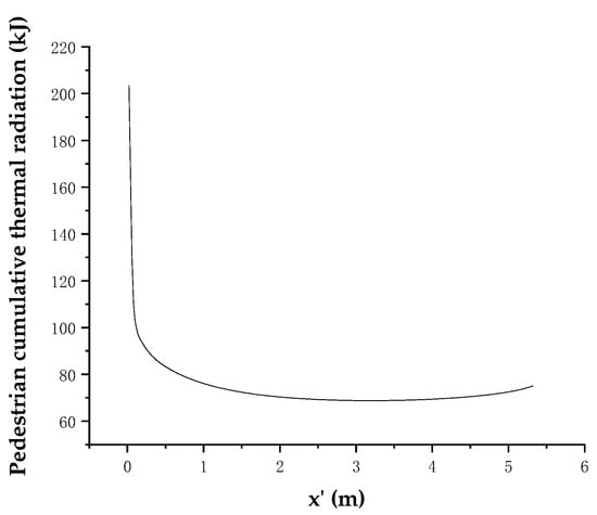 The cumulative thermal radiation absorption contributes to the impact of the thermal radiation on pedestrian damage and the damage degree of the pedestrians is determined by the thermal radiation accumulation that exceeds the endurance limit of the human body. Therefore, we assumed that the pedestrian was a black body cylinder with a radiation emissivity of 0 and the surface area towards the flame was . The pedestrian received the thermal radiation rate () was calculated according to the thermal radiation model of a rectangular flame, and according to Equation (5), the following equation was obtained: