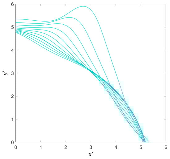 The thermal radiation accumulation of the pedestrians under the flames with different tilt angles was analyzed for . A thermal radiation flux curve of 4.5 at the plane z = 1.15 is shown in Figure 21. In the y′ direction, with an increase in the flame tilt angle, the #3 and #4 flame surfaces were closer to the pedestrian area, which increased the view factors between the flames and the pedestrian. Therefor, as the thermal radiation flux increased, the threshold curve departed from the initial point O′ in the y′ direction. In the x′ direction, with an increase in the flame tilt angle, the #1 and #2 flame surfaces were closer to the pedestrian area, but the view factors between the flames and pedestrians decreased. Due to the effect of the two factors, the threshold curve did not change significantly in the x′ direction.
