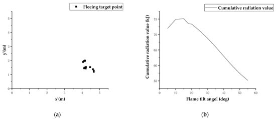 The accumulated thermal radiation received by a pedestrian from a tilted flame can be obtained using the method described in the previous sections. The evacuation destination point for the minimum cumulative thermal radiation received by the pedestrian was calculated, as shown in Figure 22a. The average evacuation destination point value was (4.3, 1.59) (unit: m) and the tilt angle to the positive y′ direction was 69.71°. The average cumulative thermal radiation received by the pedestrian was 67.5 kJ. With an increase in the flame tilt angle, the cumulative thermal radiation value received by the patient increased when the flame tilt angle was small and decreased when the flame tilt angle exceeded a certain value. Although this study did not consider the impact of high-temperature or toxic and harmful smoke generated by EV combustion, the smoke moved in the airflow direction, which increased the risk of pedestrian injury in this scenario.