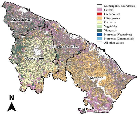 The study area consists of 4 different municipalities in the province of Bari, located in the Apulia region, in the south of Italy. The mean coordinates of the area are latitude 40.962834° and longitude 17.207541° and the elevation ranging from 0 m asl to 408 m asl. The area is characterized by a mean annual precipitation ranging from 596 mm to 622 mm and by an annual solar irradiance equal to 5124 MJ m−2. The municipalities are Mola di Bari, Conversano, Polignano a Mare, and Monopoli and cover an area of about 400 km2. They are grouped together since they constitute a single optimal collection administrative area for waste management. In fact, Apulia’s regional waste planning defines a single optimal territorial area, equal to the whole region and responsible for waste collection and disposal services, and several optimal collection areas, including a different number of municipalities, for the provision of sweeping, collection, and transportation services in order to maximize their efficiency. The study area is particularly suited to agriculture, and therefore, APW production is intense. The main crops grown inside this territory are olive trees, orchard trees such as almonds, and horticultural crops in open fields, as well as, in greenhouses, wine and table grapes and cereals. Furthermore, there are many nurseries growing horticultural crops and ornamental plants for commercial sale. Most of these nurseries are in the municipality of Monopoli. The land-use map (updated to 2022) of the study area, as well as its boundaries, are shown in Figure 1. For the elaborations of the land-use map, as well as the other maps, the free QGIS software [20] was used.