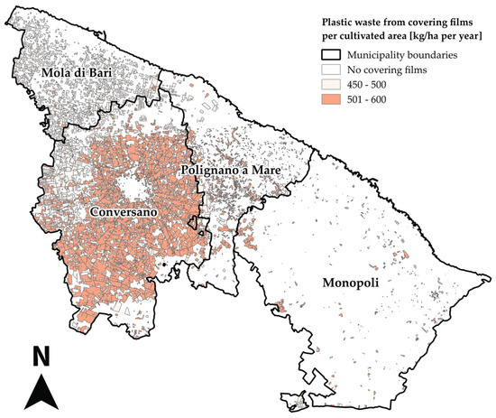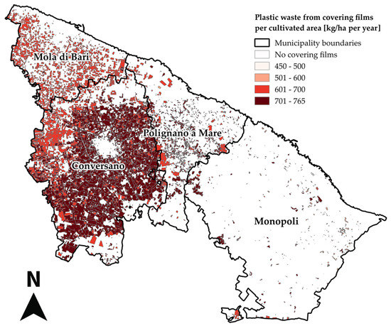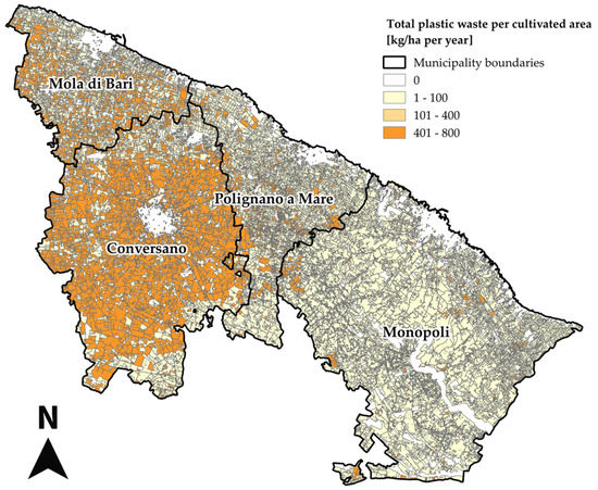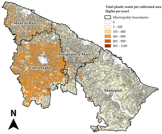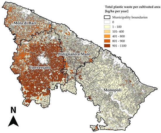 Similar results were obtained by Cillis et al. [14], who considered only plastic films, mulching films, and irrigation pipes in mapping APW through the provinces of Italy on some protected and open-field crops. The highest values were assimilated to the plastic films, followed by the mulching films and the irrigation pipes, with corresponding values of 1500 kg ha−1 y−1, 100 kg ha−1 y−1, and 40 kg ha−1 y−1, respectively.