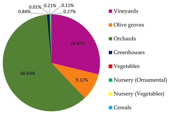 - Identifying the main crops through the support of the land-use map and the nurseries through their direct identification, thus creating the final land-use map on QGIS software (Figure 1);