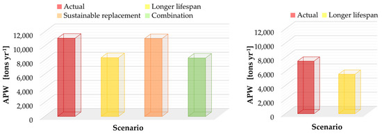 Two scenarios were hypothesized to decrease APW: longer lifespan (first scenario) and sustainable replacement of some plastic materials (second scenario). Moreover, the combination of the two scenarios (scenario comb.) was also considered. Based on this assumption, PWIs and APW were modified.