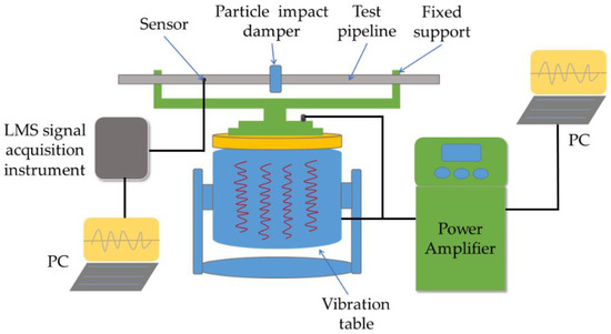 To investigate the damping performance of the particle impact damper, a random excitation experiment was conducted. Random excitation is a kind of uncertain excitation; the application of random excitation on the test pipeline can better simulate the working conditions of the actual pipeline so that the test results are more practical. The schematic diagram of the vibration damping test system is shown in Figure 4.