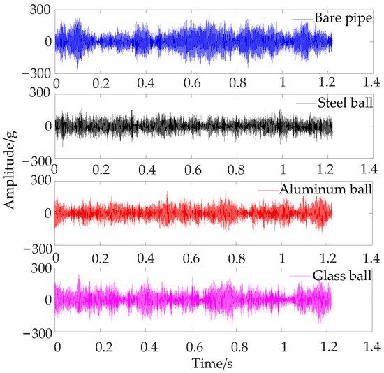 Figure 8 and Table 1 show the responses in the time domain and RMS values of the damped pipeline. When the cavity was filled with steel particles, the RMS of the response decreases by 35.7% compared with that of the bare pipe. Meanwhile, when filling with steel balls, the damping effect was improved by 10.4% and 25.3% compared to filling with aluminum and glass balls, respectively.