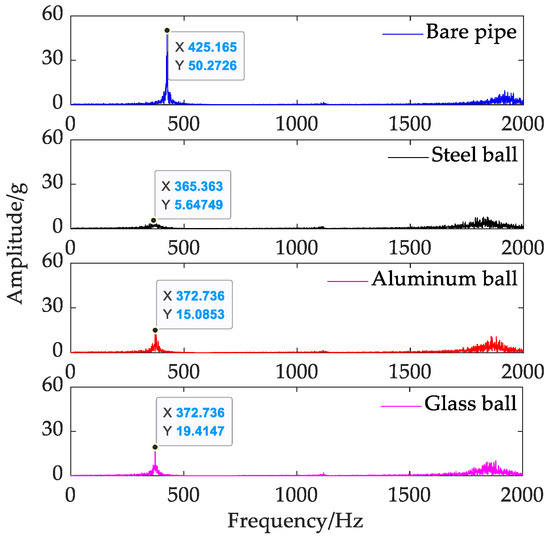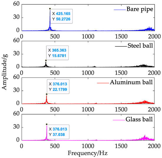 Figure 10 shows the spectral responses of damped pipelines with different materials at an 80% filling rate. When the cavity of the damper was filled with steel balls, the corresponding resonant amplitude was reduced by 88.8%, while the resonant amplitude was reduced by 70.0% and 61.4% due to aluminum and glass, respectively. The RMS values of responses in the time domain are compared in Table 2. The experimental phenomenon was similar to that observed with the 20% filling rate.