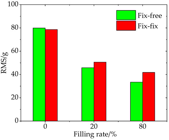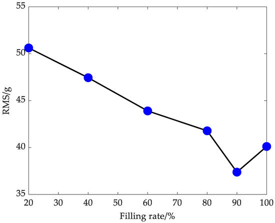 The six-cavity particle impact damper is filled with steel balls with a particle size of 1 mm and a filling rate of 20, 40, 60, 80, 90, and 100% respectively. This paper judges the size of the filling rate by weighing the mass. The specific method is to fill the cavity with particles, weigh the filled particles with an electronic scale and consider that the filling rate corresponding to the weight at this time is 100%, then multiply this weight by the filling rate selected in the test, and add a certain mass of particles corresponding to the filling rate to the cavity. The RMS values of responses under different filling rates are shown in Figure 11.