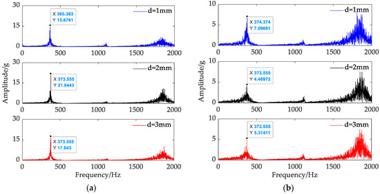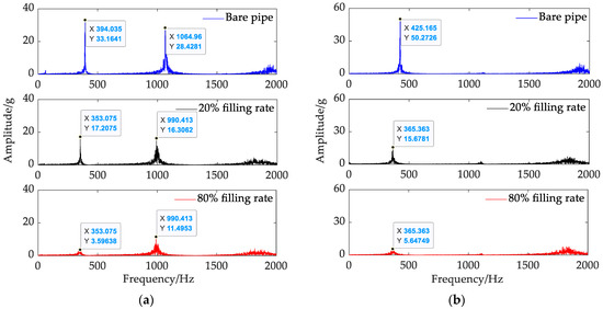 Figure 13a shows that the first-order resonant frequencies of the bare pipe in the particle impact damper filled with 20% steel balls of three particle sizes are shifted compared to Figure 8. The corresponding amplitudes are significantly reduced. Among them, the resonant frequency offset of the pipe filled with 1 mm steel balls was about 60 Hz, the corresponding amplitude was reduced by 68.8%. While the resonance frequency offset of the pipe filled with 2 and 3 mm steel balls was about 52 Hz, the corresponding amplitudes were reduced by 56.3% and 64.9%, respectively. According to the comparison of the first-order resonance amplitudes of the three particle sizes, the particle impact damper filled with 1 mm steel balls has the best damping effect at a 20% filling rate, followed by that filled with 3 mm balls, and by that filled with 2 mm balls. Similarly, the particle impact damper filled with 2 mm steel balls has an excellent damping effect, followed by that filled with 3 mm balls, and by that filled with 1 mm balls at an 80% filling rate in Figure 13b.