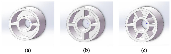 A test pipeline with a diameter of 16 mm was selected and three kinds of particle impact dampers were designed according to the pipeline diameter, as shown in Figure 14. To investigate the effect of the different number of cavities on the vibrational damping performance, three types of particle impact dampers with two, four, and six cavities were selected.