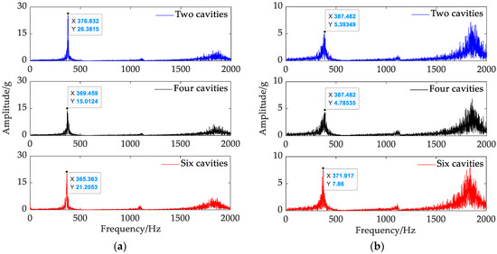 Comparison of frequency response with different cavities at the (a) 20%, (b) 80% filling rate.