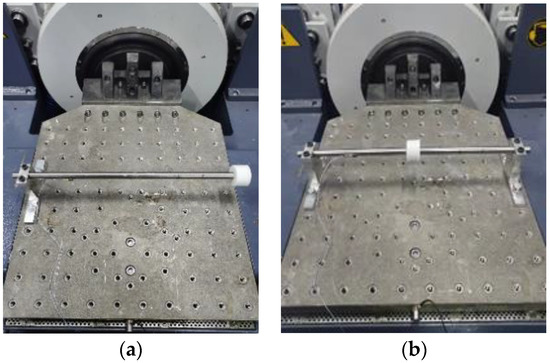 This paper refers to the vibration mode of the test pipeline (external diameter ϕ = 16 mm, wall thickness t = 1 mm) with a length of 50 mm, where the measuring point of the sensor (PCB, model 352C22) was 12.5 cm away from the left end of the pipeline, and the particle impact damper was selected at the middle of the pipeline. The instruments required for the test and the test layout of the vibration table (ES-10-240, frequency range 2–5000 Hz) are shown in Figure 5.