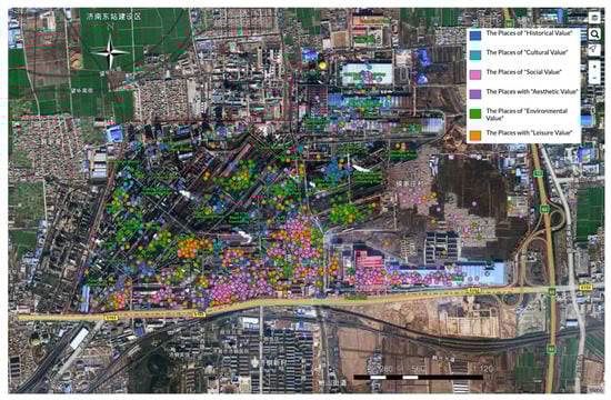 GIS spatial analysis has been criticized for its difficulty in dealing with subjective data []. Some scholars have attributed the reasons for this to two things: firstly, the lack of methods to obtain spatially accurate subjective data; and secondly, the spatially variable nature of subjective data makes it difficult to integrate and analyze with traditional objective data []. Participatory mapping technology, which collects structured spatial information of attitudes and value types by means of point data and mapping, has better solved the problem of obtaining subjective data. In the case of Jigang, the control of data accuracy becomes the key to the work due to public participation in the mapping process. In this paper, some aspects were found that may affect the accuracy of the data: firstly, the uneven map reading ability of the participants may produce errors; secondly, there are many landmarks in some parts of the study area, where point-like features are obvious and easy to identify, and the accuracy of filling in the map is high, while there are few landmarks in other relatively open areas, which are surface work areas, and the interviewees fill in the map in a more variable position, which may underestimate the concentration of attitudes and values. Both of these problems require more careful map reading and map preparation, an in-depth interview-style survey process, richly annotated and visualized maps or images, and the use of other supporting images or textual information would help to improve this situation.