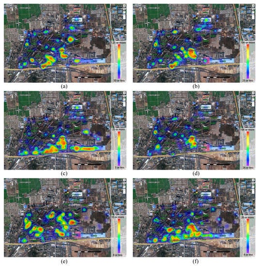 The hotspot distribution map of landscape values in the site: (a) Historical value; (b) cultural value; (c) social value; (d) aesthetic value; (e) environmental value; and (f) leisure value. (The basemap is made based on Mapbox Map Service China Edition, and Chinese can be ignored).