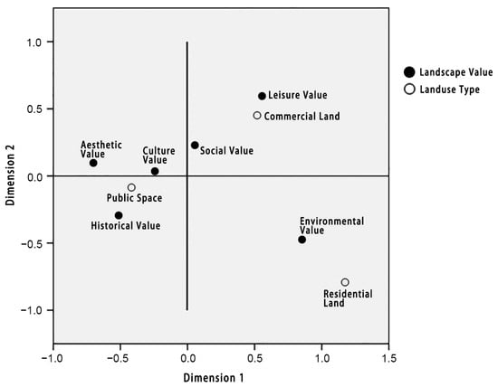 Among the six landscape values, leisure value and social value are located in the first quadrant. It can be seen that the places with higher leisure value perceived by residents are closely related to commercial land in land use types. Artistic values and cultural values are located in the second quadrant, which is mainly related to public space. In addition, the historical value is distributed in the third quadrant, which corresponds to public space as well as artistic value and cultural value, reflecting that these three landscape values are closely related to public space. The environmental value is distributed in the fourth quadrant, and the corresponding land use type is residential land, which reflects the increasing demand from residents for the environmental quality of living space, and a good environment is beneficial to living space.