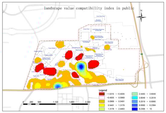 The degree of value compatibility reflects the comprehensive compatibility relationship between the six landscape values perceived by stakeholders and the renovation and renewal scheme, thus helping to judge the attitude of stakeholders in Jigang toward the renovation and renewal scheme and its spatial change characteristics. As shown in Figure 5, the degree of compatibility is divided into 10 grades from −1.5 to 10, forming obvious spatial differentiation characteristics in the whole study area, first by forming a positive compatibility distribution center. The degree of compatibility of the 3200 m3 blast furnace and the south gate area is greater than 5.00. This area is mainly protected land and green space, and historical value, artistic value, social value, leisure value and cultural value are concentrated in this area, forming a high-value center. Secondly, the distribution center for the negative degree of compatibility is formed. In the site area, the compatibility of several stacking areas, stockyards, gas processing, storage and chemical plants where coal mines, iron ore and other related raw materials were stacked is negative (−1.5~−0.4), showing incompatibility and forming a center. Because this area is the core area of industrial production in Jigang and its pollution degree is high, the landscape value of this area is negatively compatible with renovation and renewal. Thirdly, the positive low-value degree of compatibility region is formed. On the periphery of the two positive compatibility centers, a positive low-value degree of compatibility region (0.5~2.4) is formed. These areas are in a position of excessively high value to low value, and there are few perceived value points, resulting in low compatibility; the area along the east–west urban expressway and viaduct on the south side of the base has a degree of compatibility of 0.1–2.0. Because of its convenience along the street, it is basically far away from the core zone of industrial production, and in addition, the positive value and negative value are mixed and replaced, so it also forms a belt area with a positive low-value degree of compatibility. From the degree of compatibility, four potential public attitude distribution areas can be distinguished: the 3200 m3 blast furnace and south gate area with support as the main attitude area; chemical plants, coal mine storage areas, iron ore stockyards and silos are mainly conflict-oriented attitude areas; the surrounding area of the blast furnace and south gate and the area along the south main road belong to the mixed attitude area of support and conflict; and other low-value areas are areas where attitudes are not obvious.