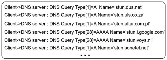 In the following parts, we analyze the pre-identification method based on the Snowflake communication process from the perspective of Snowflake communication messages. Snowflake utilizes WebRTC technology to establish peer-to-peer connections that require NAT traversal through STUN (Session Traversal Utilities for NAT) [32], which is mostly used in real-time-communication scenarios. Snowflake provides a list of available STUN server domain information, which is usually hard-coded in Tor’s configuration file torrc. When the Snowflake client first starts up, it randomly selects a subset of these STUN server lists to initiate DNS requests. It looks for the hostname resolution using both IPv4 and IPv6(DNS ‘A’ and ‘AAAA’ records). The set of DNS request messages sent is shown in the Figure 4.