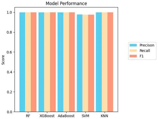 Based on the WebRTC DTLS handshake fingerprint dataset collected and composed in the previous subsection, we conducted corresponding experiments on Snowflake-based Tor traffic identification. We carried out comparison experiments on different machine learning algorithms for extracting handshake fingerprint features to identify Snowflake traffic, and discovered that the fingerprint features extracted by this method perform well and have similar results for five machine learning algorithms, namely Random Forest, XGBoost, AdaBoost, LinearSVM, and KNN. The specific experimental results are shown in Figure 5.