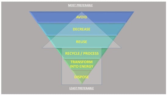 Figure 1. The hierarchy of waste disposal. With reference to the increase in food demand, shell waste could only be considered from the point of reuse down to dispose, as adapted from the European Commission’s Green Growth and Circular Economy package of the Europe 2020 Strategy (https://ec.europa.eu/environment/green-growth/index_en.htm).
