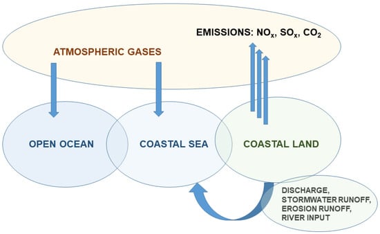 Figure 3. Schematic diagram of the sources of ocean acidification. Coastal land is exposed to a variety of acidic sources, adding to the coastal sea, and varying across time and space, as adapted from Clements and Chopin [59].
