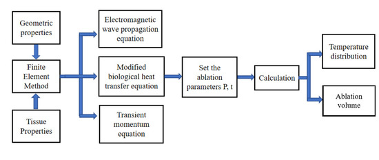In this study, after establishing the geometric model, the material properties are set, the heat transfer equation and electromagnetic equation are coupled, and then the transient momentum equation is combined. The ablation parameters are set. The temperature distribution, ablation zone size and ablation volume of the porous lung tissue containing the tumor are calculated using the finite element method. The scheme of the numerical simulation is shown in Figure 2.