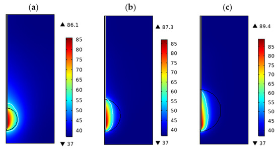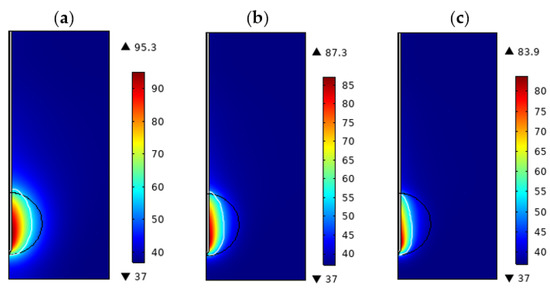 The temperature distribution of the lung tissue with tumor diameters of 1.4 cm, 2.0 cm, and 2.6 cm, porosity of lung tissue () is 0.7, porosity of tumor tissue () is 0.6, at P = 10 W and t = 360 s is shown in Figure 3a–c, respectively. It can be seen that the ablation areas of the tissues are all nearly oval, and the temperature of the tissues at the slot of the microwave antenna is the highest. The highest temperatures reached by the ablated lung tissue were 89.4 °C, 87.3 °C, and 86.1 °C for tumor diameters of 1.4, 2.0, and 2.6 cm, respectively. The lung tissue temperatures obtained in the numerical simulation are closer to the temperature distribution in the study by Keangin et al. [21]. Observing Figure 3a, we found that the ablation area completely covered the tumor, whereas, in Figure 3b,c, the ablation area sizes are much smaller than the tumors. Therefore, we believe that P = 10 W, t = 360 s is sufficient to completely ablate a tumor with a diameter of 1.4 cm, whereas tumors with the diameters of 2.0 cm and 2.6 cm would require increased ablation power or ablation time in order to be completely ablated.