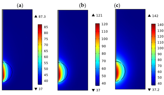 Temperature distribution of porous lung tissue at different ablation powers. (t = 300 s, d = 2.0 cm, = 0.6, = 0.7): (a) P = 10 W (b) P = 20 W (c) P = 30 W.