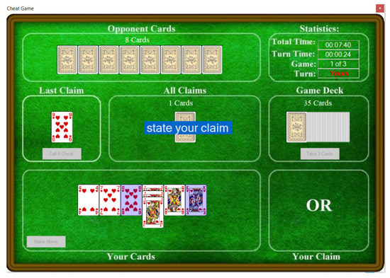 We use the implementation of Mansbach et al. [55] for the “Cheat-Game” (see Figure 1 for a screenshot). During game-play, the claims of the players are recorded and added to our data set along with the actual cards played. This information allows us to determine whether a claim is true or false.