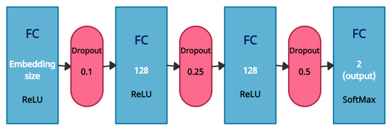 For our model’s classification task, we use the same architecture as the Five Sound Feature Model (FSFM) from [55], which achieved the highest scores for the deception detection task in a very similar environment. We term this classifier MNA (Mansbach, Neiterman, and Azaria [55]). MNA’s architecture consists of three fully-connected layers, using the ReLU activation function and dropout after each. The output layer uses a softmax activation function with two classes.