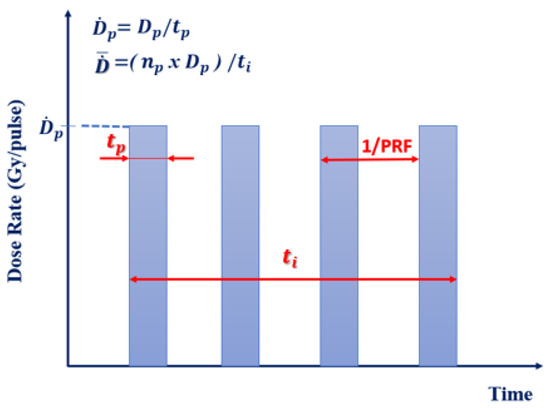In the early 1960s, some experiments demonstrated that a very-high-dose rate in ultra-short radiation pulses increased cell survival, that is, it spares healthy tissues, compared to conventional (CONV) treatments [1,2,3,4]. After three decades, this phenomenon was again investigated and confirmed by Vincent Favaudon and their team [5]. In FLASH RT, the entire dose is delivered in a very short time. The definition of the FLASH regime demands the specification of different inter-dependent temporal parameters such as pulse repetition frequency (PRF), pulse number (), pulse width (), dose per pulse (), in-peak dose rate (), average dose rate (), and the total irradiation time ().