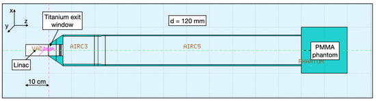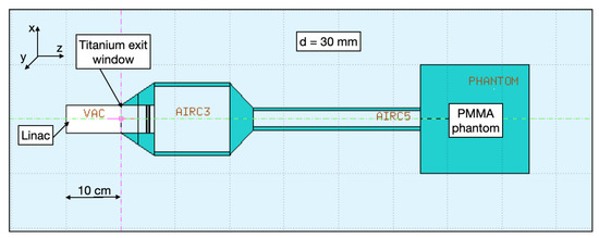 Experimental measurements were compared with simulations obtained by means of the MC software 2020.0.10 FLUKA version [27,28]. In particular, the accelerator beam optics from the titanium window (at the end of the linac) to the end of the applicator was simulated.
