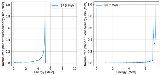EF at 5 MeV (left) and 7 MeV (right) normalized planar fluence out of the linac. The energy bin width is 50 keV. The two energy spectra were obtained using the TSTEP code, a derivative of Parmela, for beam dynamics simulation [29].