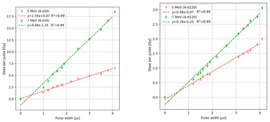 Dose per pulse measurements with film at the end of the A-d30 (left) and A-d120 (right), for 5 MeV electron beam (red) and 7 MeV (green), as a function of the pulse width. The dashed lines show the linear fit.