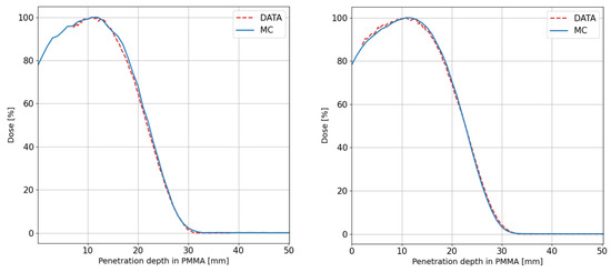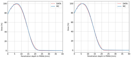 Figure 6 (red dots) reports the experimental data of PDD measured along the beam axis as a function of the depth in the PMMA phantom, for A-d30 and A-d120, and for electron beams with the energy of 5 MeV. Figure 7 reports the data relative to the case of 7 MeV. Data concerning the depth–dose curves were normalized to their maximum value at a depth of 12 mm for the beam energy of 7 MeV and of 7 mm for the beam energy of 5 MeV.