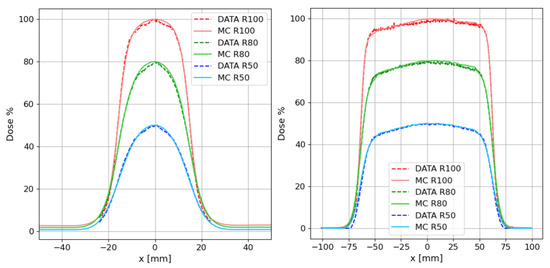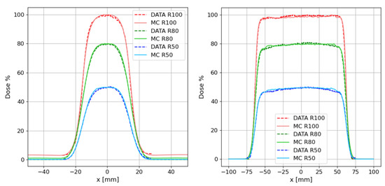 Starting from the data of the PDDs, the lateral dose profiles, at the points R100, R80, and R50, were obtained as shown in Figure 8 and Figure 9 for the energies and applicator cases considered in this analysis. The lateral dose profiles were investigated at 12 mm (R100), 17 mm (R80), and 21 mm (R50) depth for 7 MeV and at 7 mm (R100), 11 mm (R80), 14 mm (R50) depth for 5 MeV. The measured and simulated profiles were normalized to the maximum dose value. We observe a very good flatness over almost the entire field of radiation for A-d120. The flatness also remains fairly good for the case of A-d30.